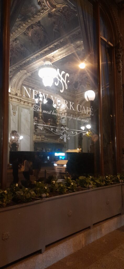 We retrace our rides and cross the iconic New York Café, rated as the most beautiful café in the world, with its opulent interiors brightly lit. It looks cozily inviting to us pedestrians.