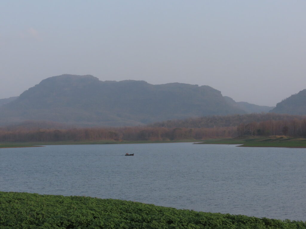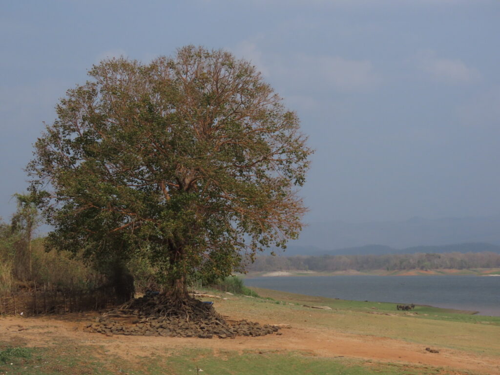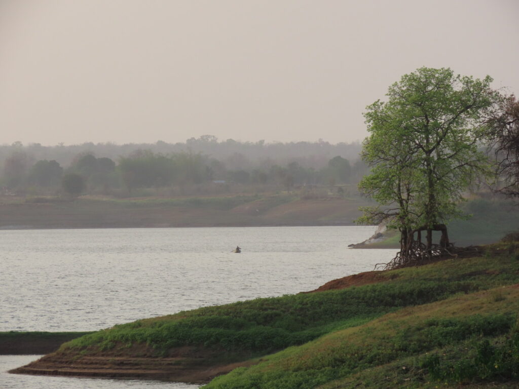 We reach the reservoir bank without encountering anything, much to my relief and the man’s disappointment. The forest across the low water and the range behind, glow in the warmth of a setting sun. A few canoes with fishermen complete the picture. Retracing our way we cross a tendu tree and I return with a rich bounty of a leaf and a piece of the buoyant bark of a cork tree. A junglefowl scampers noisily in the undergrowth letting out a loud cry. Uprooted lantana, a very sly weed, has been stacked upside down. It will throw down roots immediately otherwise. While searching for the owl we see a Greater Flameback fly into its home in a tree and disappear for the night. So should we since the sun has almost called it a night.