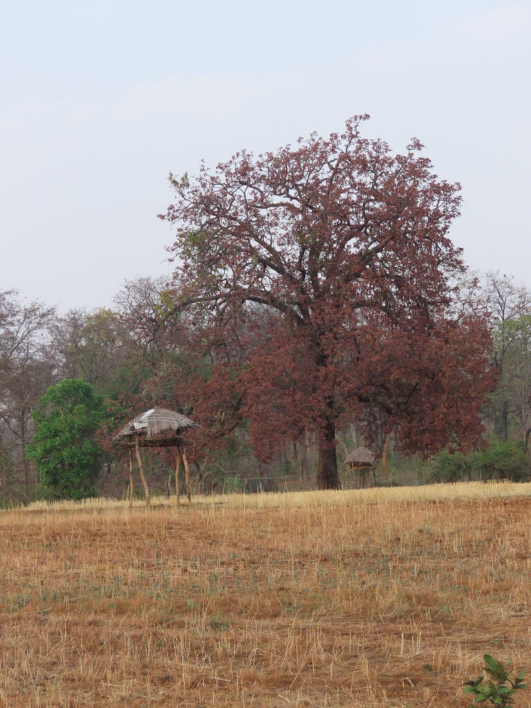 We reach the gate of Jamani Dev buffer zone early in the evening after a short rest and change for a walking excursion. The adjoining fields are dotted with thatched domed machans and mahuas in bloom. The fresh garnet red flowers contrast strikingly with the golden fields.