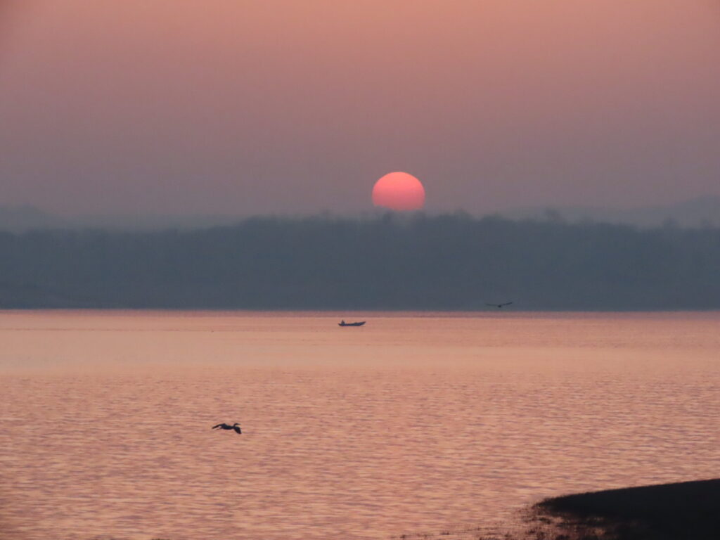 We are out before the sun the next morning waiting to get into the boat to take us across the reservoir for the safari. A perfect half moon hangs in the inky sky. Satpura might be the only reserve with an entrance like this. As we dock across, the sun makes an appearance in a sky pink with promise.