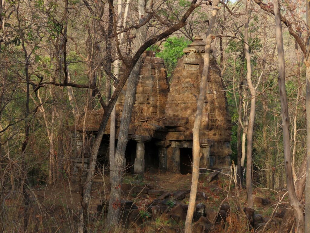We explore scattered small pools and the track twists and turns through the dry forested hillocks drained by streams lined with green jamun trees. As we make our way down a steep slope and take a crazy bend I can only very intently admire a khejri tree to take my mind off the angle of the vehicle. We are rewarded with the surprising sight of twin temples. Villages have been relocated out of the core zone but these centuries old stone temples are rooted here as much as the trees surrounding them.