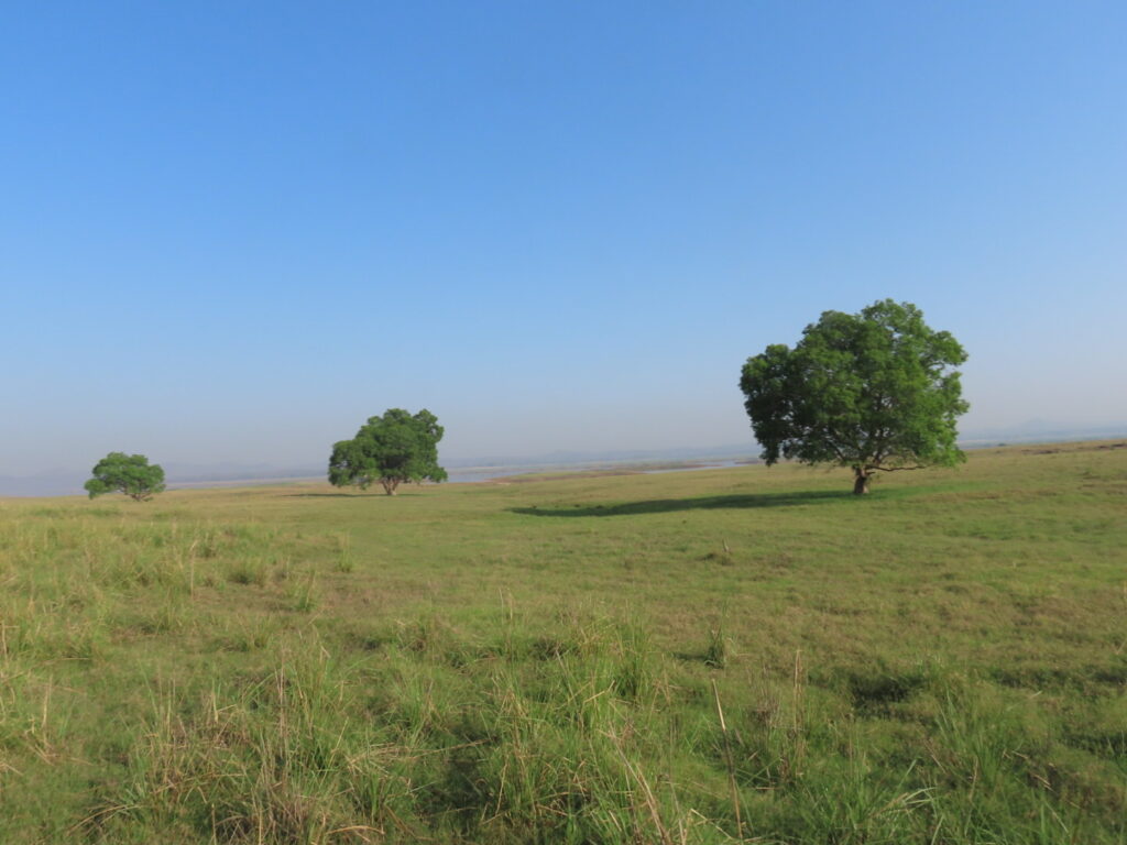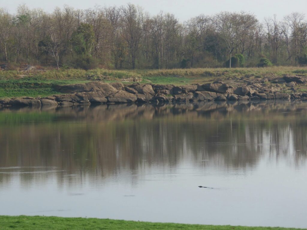 A drive on flat rocks sloping into a puddled stream puts us in a beautiful valley where the Sonbhadra curves sinuously between wide grassy banks. While the forest here is populated with crocodile bark trees with scaly grey trunks, in the placid water a crocodile languidly makes it’s way.