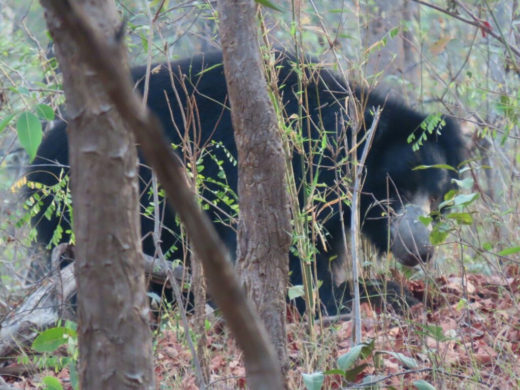 We soon chance upon a massive bear feasting on mahua flowers. These big black beauties with grey snouts love mahua but get high and then sleep off. Sounds familiar! We get a fill of him while he gets his, of the flowers on the forest floor.