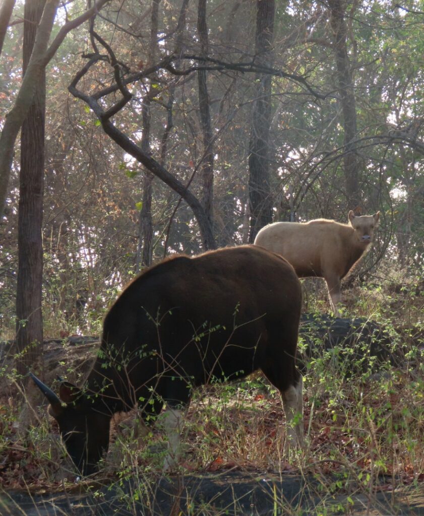 The junglefowls are active early the next day and we hear them crow raucously and catch a glimpse of a big grey rooster. A rare leucistic Gaur calf with a herd on a rocky mound is pointed out to us.