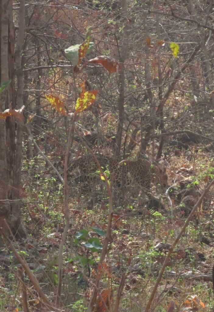At one watering hole the langurs let on about a leopard that wants to head to the hillock across the pond. It has more patience than us and we give up and head for breakfast at the elephant camp nearby. As we start back for the same pond our guide spots her. The leopard blends beautifully with the foliage and if she were not on the move we would have missed her. With an unhurried gait she makes her way silently through the undergrowth, soon disappearing. She clearly does not reciprocate our enthusiasm for an encounter.