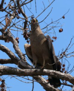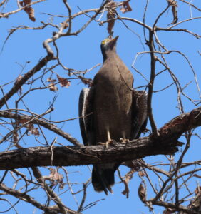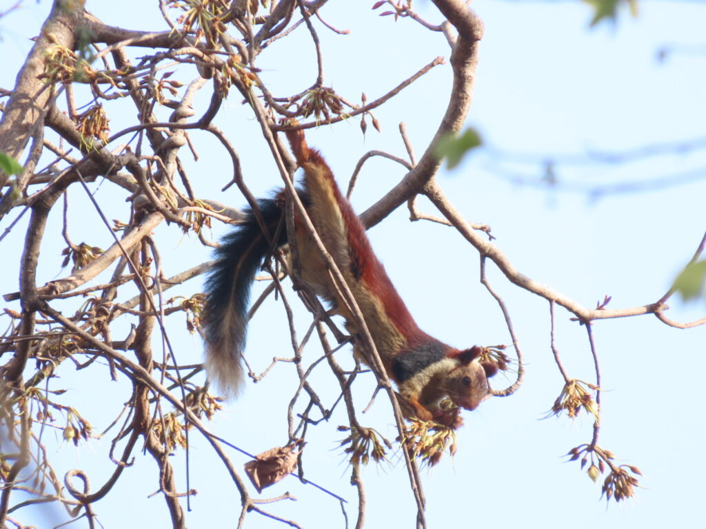 A Malabar Giant Squirrel, its burgundy coat burnishing a deeper shade in the sun, nibbles high up on a mahua, spreadeagled to get to the last bunch on the branch. We reach the fertile floodplains of the reservoir and halt near a causeway over a stream. There are fresh pug marks of a male tiger from the morning heading to Churna zone but we cannot cross over. We return after being stared down by an irate Serpent Eagle and watching two others having a very verbal face off.